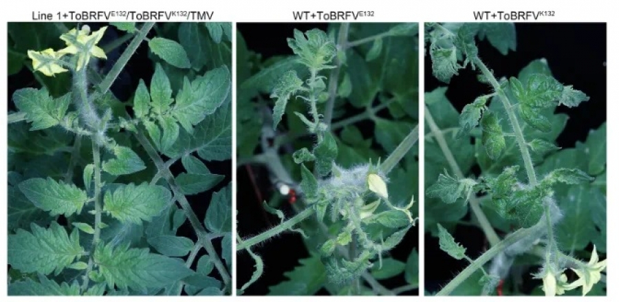 为了克服病毒逃逸问题,研究团队将两个关键突变位点叠加,构建出双突变体Tm-22-S723Y/N744D。该突变体在转基因番茄中表现出卓越的广谱抗性:它能同时抗ToBRFVE132、ToBRFVK132以及TMV三种病毒,即使在同一植株的不同叶片上同时接种这三种病毒后,植物仍保持健康,检测不到病毒侵染,也无病毒症状(图2)。