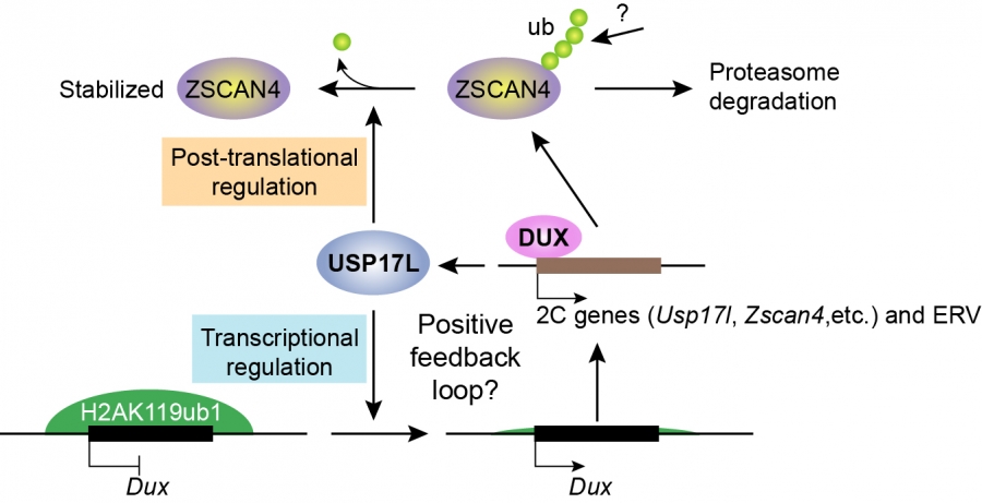 在小鼠胚胎干细胞中,Usp17l敲低或过表达可以显著抑制或促进2C基因的转录。而在Usp17l过表达的细胞中敲低Dux时,原本上调的2C基因呈现部分下调趋势,表明Usp17l对2C基因的激活可能通过Dux依赖和非依赖的途径来实现。进一步研究发现,Dux基因位点富集抑制性组蛋白修饰H2AK119ub1。作为去泛素化酶,USP17L(主要是USP17LE)可以降低H2AK119ub1在Dux上的富集,进而激活Dux及下游2C基因的表达。有意思的是,已有研究表明Usp17l也是DUX的靶基因,因此DUX 和 USP17L 之间的相互调节可能构成一个正反馈回路,有助于快速诱导 2C 基因的表达。另外,研究者还发现USP17L 的过表达提高了ZSCAN4 蛋白的水平,并且胚胎干细胞中 Zscan4+ 细胞(2-细胞样细胞)比例也有所增加。进一步机制研究表明,USP17LE可通过直接结合ZSCAN4 ,去除ZSCAN4上的泛素化修饰进而抑制其被蛋白酶体降解。