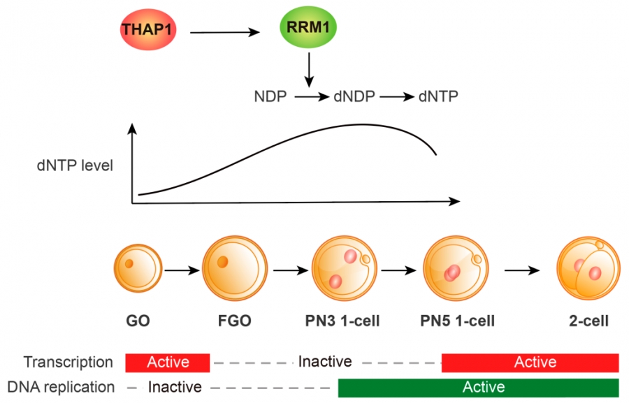 图1. THAP1通过转录调控下游基因Rrm1,保障受精后第一个细胞周期所需dNTP供应,支持1细胞向2细胞转变及合子基因组激活(ZGA)
