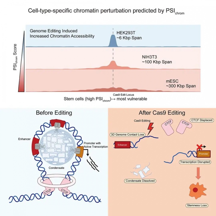 此前的基因编辑安全研究,大多聚焦在占基因组~3%的编码区的脱靶突变,对非编码区的编辑影响少于深入探索。而清华团队的研究发现,非编码区的基因编辑,即使切割位点远离调控元件,也可能引发连锁反应,这种影响还会因细胞类型不同产生巨大差异:在已分化的细胞中,编辑引发的染色质扰动范围较小,仅延伸几千碱基的距离;但在干性的细胞中,如小鼠胚胎干细胞等细胞中,扰动范围会放大数百倍,能延伸至几十万碱基的距离,在基因组里引起大范围的调控改变。